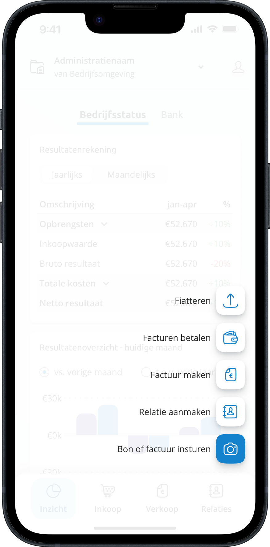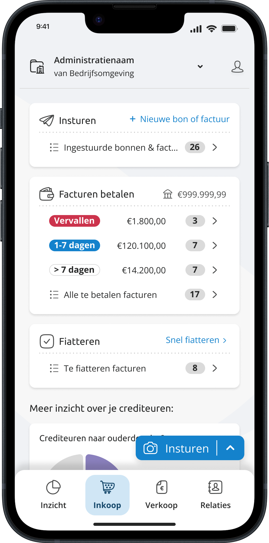 A floating action button allows the user to start the most important flows from every home page.