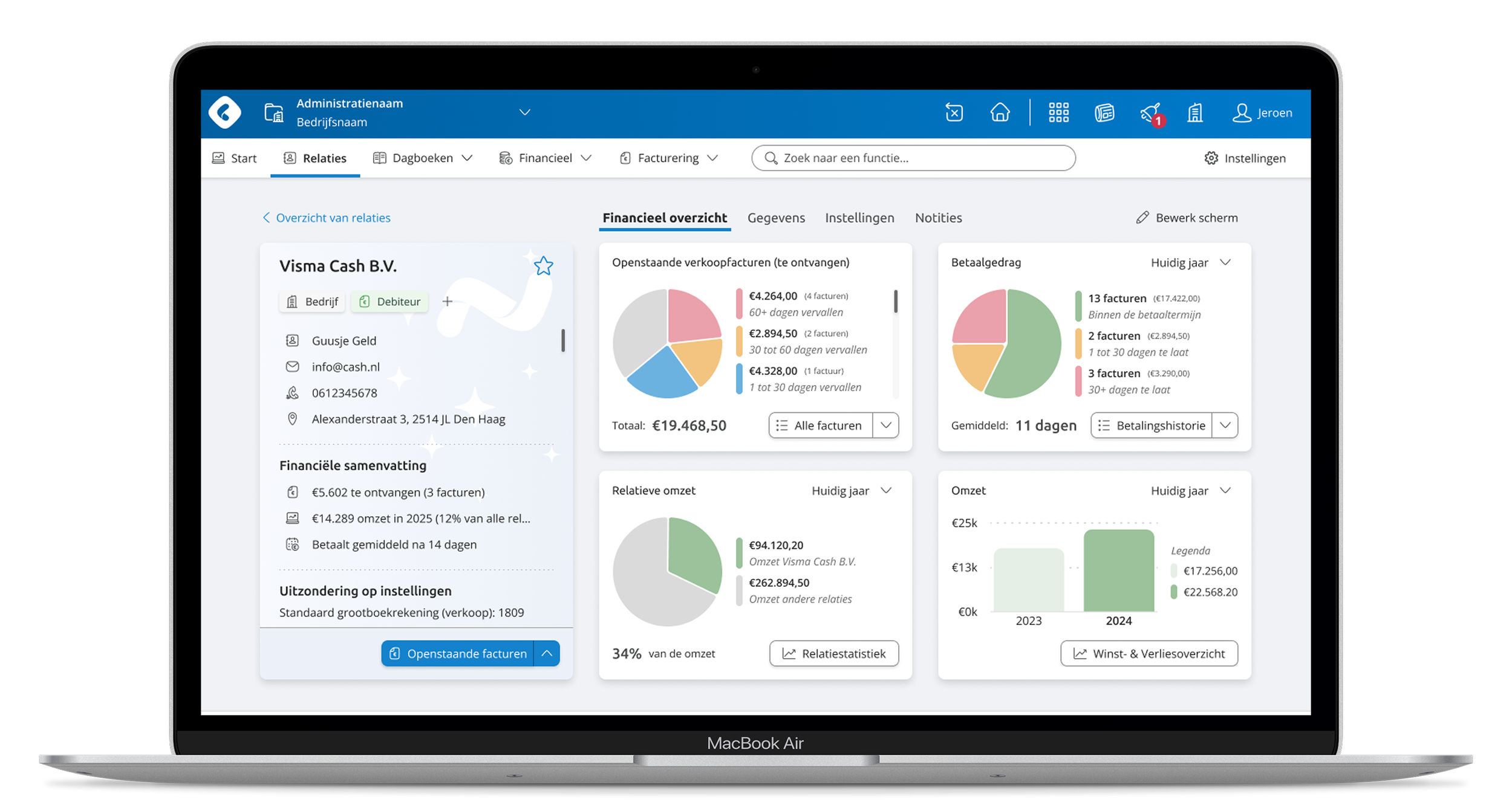 Viewing a contact of your company. Essential information and call-to-action button in a fixed container. Focus on financial insight widgets. Information and settings found in different tabs.