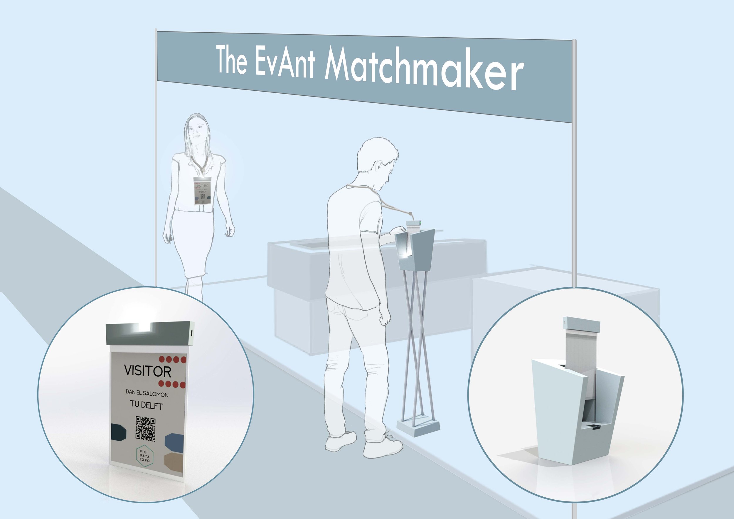My master's graduation project has lead to the design of the EvAnt Matchmaker. This design can best be described as a self-organizing system of communication in which trade fair visitors receive subtle suggestions on which stands to visit, based on the opinions of previous like-minded visitors. It has been inspired by the pheromone-based communication used by ants in their foraging behaviour.