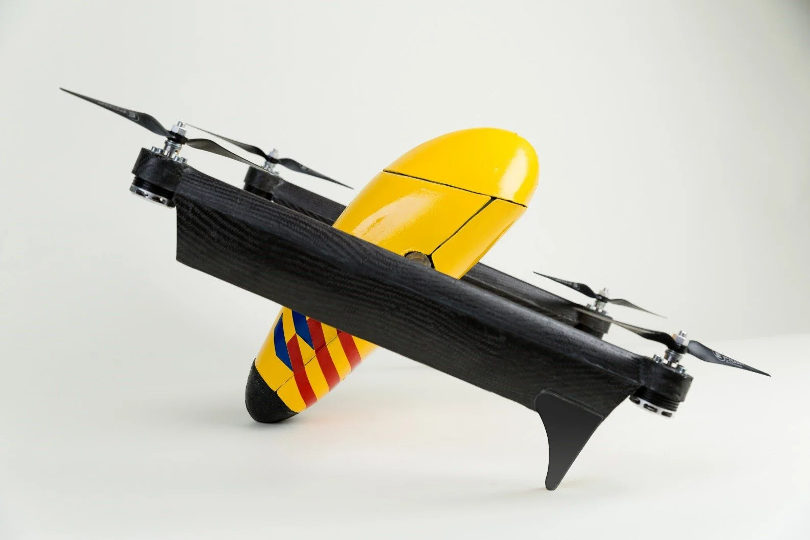 Flight speed was increased is in three ways: an aerodynamic design of the shell, optimized components, and a 70 degree rotation of the drone's body relative to its arms. This last feature had an extra benefit: after the drone has landed, it raises the front of the body (which contains the user interface) upwards: away from the dangerous propellers. It also presents the interface to the user, making it clear where the interaction should begin.